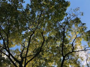 風が吹くと、沢山の黄緑色の葉がクルクルと回転しながら落ちてきたり、どんぐりがポトポトと頭やカバンに降ってきて、ずっと上ばかり見て歩いていました。